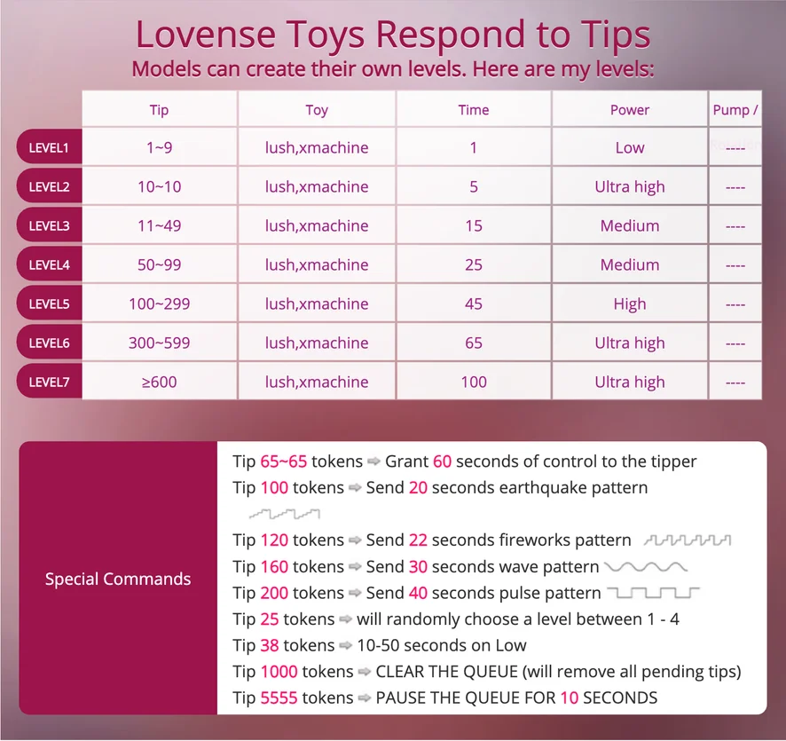 Lancap Menggunakan Tangan, Pancut Atas Muka, Pancut Dalam, Merokok, Melancap, Main jari, Kulum, Gaya Anjing, Alat Permainan Seks, Pancut, Tarian Bogel, Separuh Bogel, Tampar Punggung, Tarian Erotik, Sembang Lucah, Dildo atau Penggetar, Orgasma, Gaya Berkuda, Duduk Atas Muka, Seks Tetek, Pertunjukan Minyak