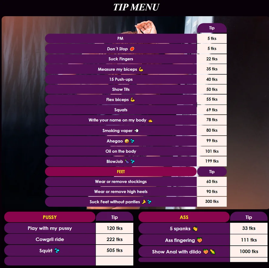 Tarian Erotik, Menunjukkan Lurah Faraj, Merokok, Sumbat Mulut, Pertunjukan Minyak, Separuh Bogel, Goyang Jongket, Sembang Lucah, Korset, Kulum, Dua Serentak, Dubur, Tampar Punggung, Main jari, Dildo atau Penggetar, Ahegao, Duduk Atas Muka, Hisap Sedalam Mungkin, Melancap, Lancap Menggunakan Tangan, Pancut, Tegar, Gaya Berkuda
