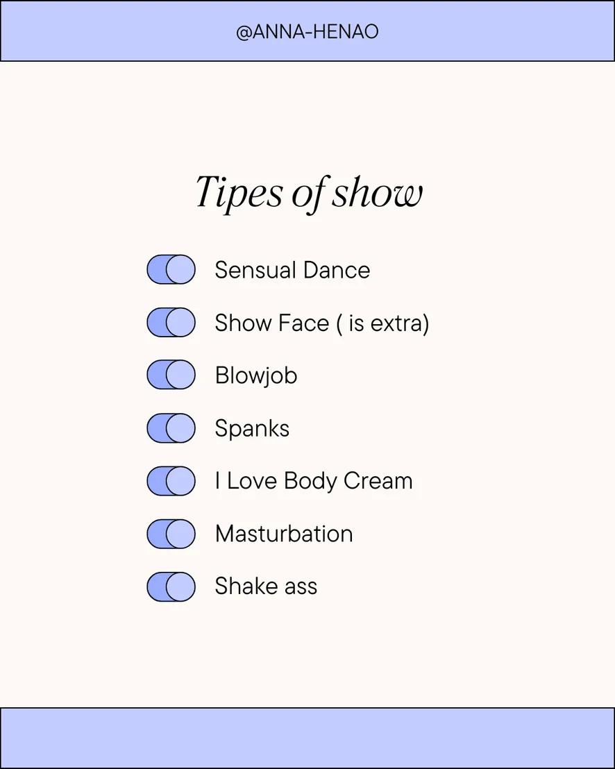 Gaya Anjing, Ahegao, Tampar Punggung, Tarian Erotik, Menunjukkan Lurah Faraj, Separuh Bogel, Tumit tinggi, Hisap Sedalam Mungkin, cream on the breasts, shake your ass, Goyang Jongket, Orgasma, Tarian Bogel, Nilon, Melancap, semen on the ass, Penilaian Zakar, Main jari, Alat Permainan Puting, Kulum, Seks Tetek, Tegar