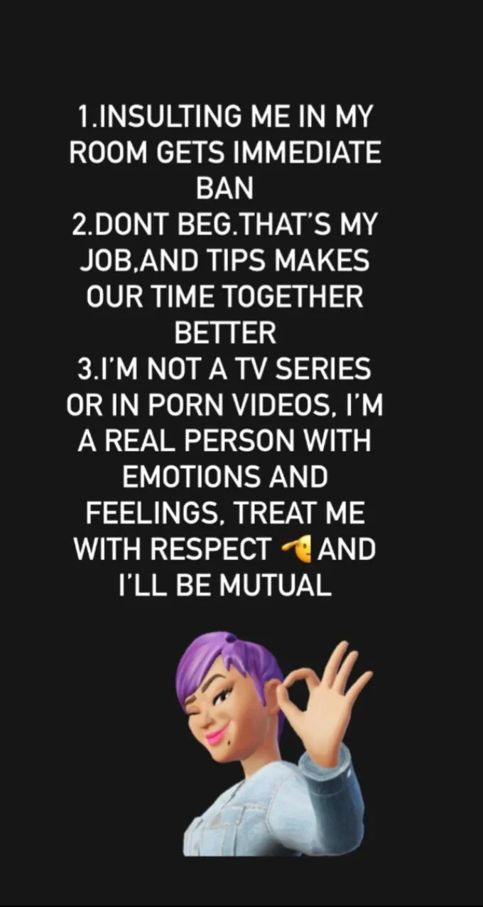 BUT REMEMBER THIS PERSON YOU SEE ON SCREEN HAS A LIFE TOO OUTSIDE THE SCREEN JUST LIKE YOU . IM JUST HERE TO WORK AND PAY MY BILLS NOT HERE TO MEET AND HAVE REAL LIFE RELATIONSHIP. LETS STAY VIRTUAL AND ENJOY